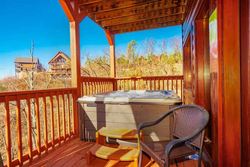 The lowest level of this cabin features the theatre room and an additional two bedrooms. There is also an additional deck with a hot tub.