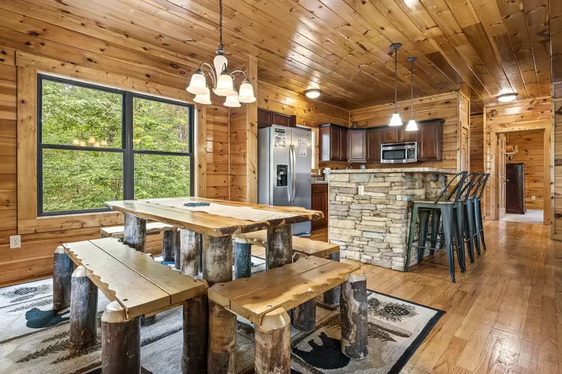 Your group will enjoy gathering at A Smoky Hideaway cabin in the great room with gas fireplace or as a group in the home theater room with surround sound, tiered seating and 9 foot theater screen with projector. The upper level game room with pool table, foosball, classic arcade game with 200+ games and wet bar provides a great entertainment room. Relax on your covered deck on a porch rocker or soak in the 101 degree hot tub.