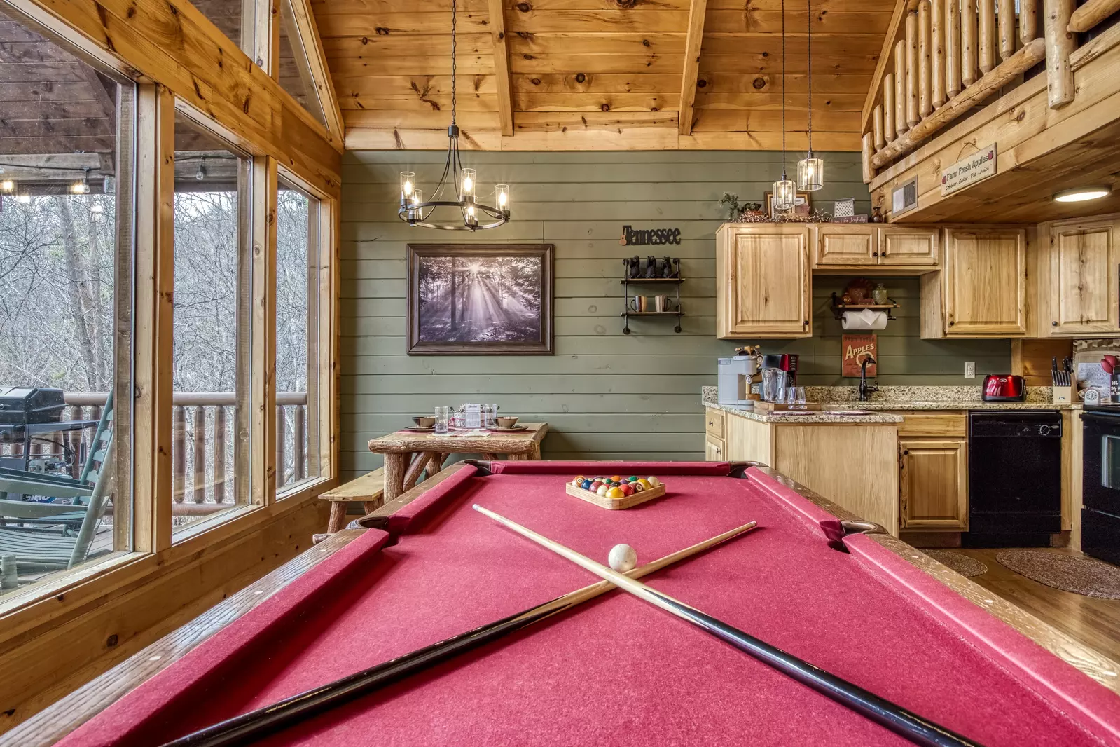 Wears Valley Honeymoon Cabin "A Walk in the Clouds" - Pool table, dining area and kitchen