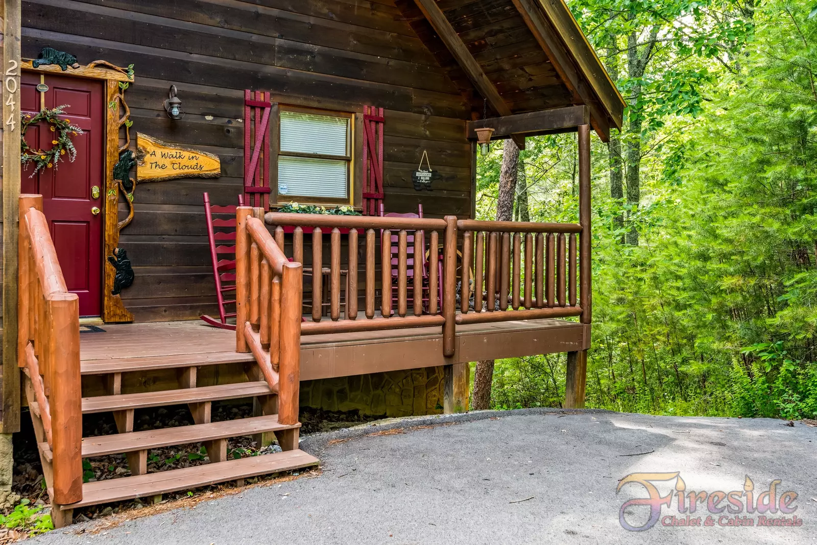 Pigeon Forge Secluded Cabin "A Walk in the Clouds" - Covered Entry Deck with Rocking Chairs