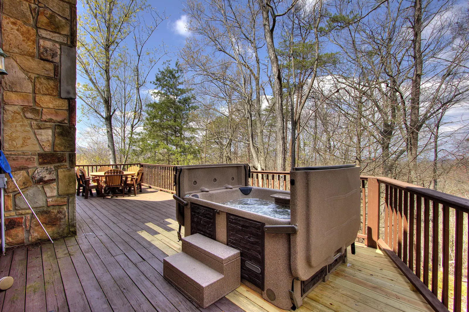 Upstairs, an open loft area provides entertainment with two arcade games and a Foosball table, plus twin bunk beds. A private King bedroom with a shared shower/tub combo bath completes the upper level. Step outside onto the wrap-around porch to soak in the stunning views from the relaxing hot tub or enjoy the fresh mountain air from the patio furniture. Almost Heaven truly lives up to its name, promising a memorable and peaceful escape.