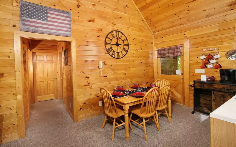 Also on the covered porch are rocking chairs and a gas grill, wonderful for a summertime barbeque. Stop by the grocery store to pick up the food items you need for your vacation – the kitchen of American Eagle already comes fully stocked with all of the utensils you could desire! With spacious counter tops, full appliances, and all the mixing bowls and cookie sheets you need, the kitchen of this Pigeon Forge cabin is perfect for those on a lengthy vacation. When you don't feel like heading into town and waiting in line at restaurants you can enjoy family meals in the peace of your own cabin.