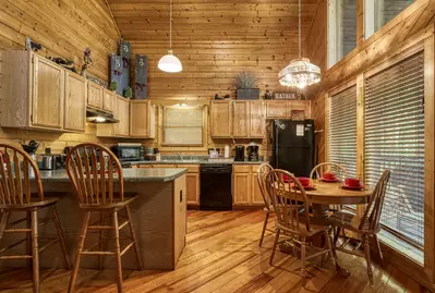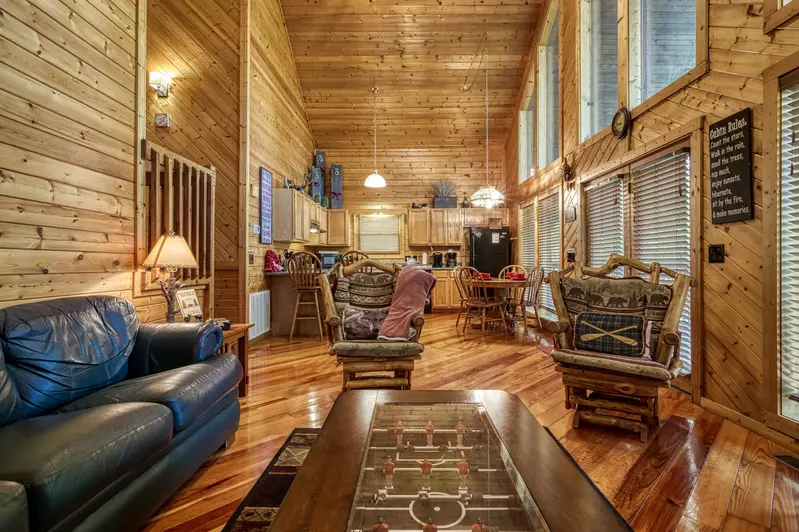 Pet Friendly Pigeon Forge Cabin, unit 366 Angels Gift, is a great cabin for a secluded family getaway. This two-bedroom chalet features two bedrooms, one with a king size bed, and one with a queen size bed, and 2 bathrooms, each with a whirlpool tub. The living room and kitchen sit in a lowered area and off the entrance and have vaulted ceilings with floor to ceiling windows where you can sit back and take in the beauty of the Great Smoky Mountains. The living room comes fully equipped with a sleeper sofa, coffee table with built in foosball game, seasonal wood burning fireplace, and a 50-inch TV. The fully equipped kitchen offers a coffee maker, microwave, refrigerator, and dishwasher. You can also soak away the day in the hot tub will taking in a serene, wooded view. Dogs are welcome but must be under 35 lbs and additional fees apply and must follow Fireside Chalets pet policies. Parking for up to 4 vehicles. Non-smoking. Sleeps 6.