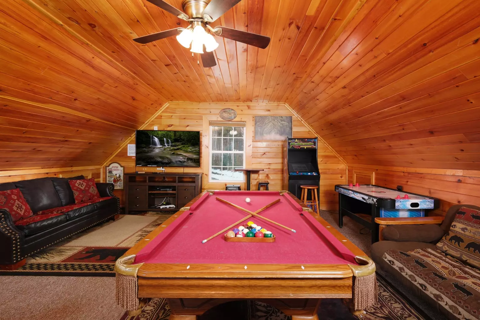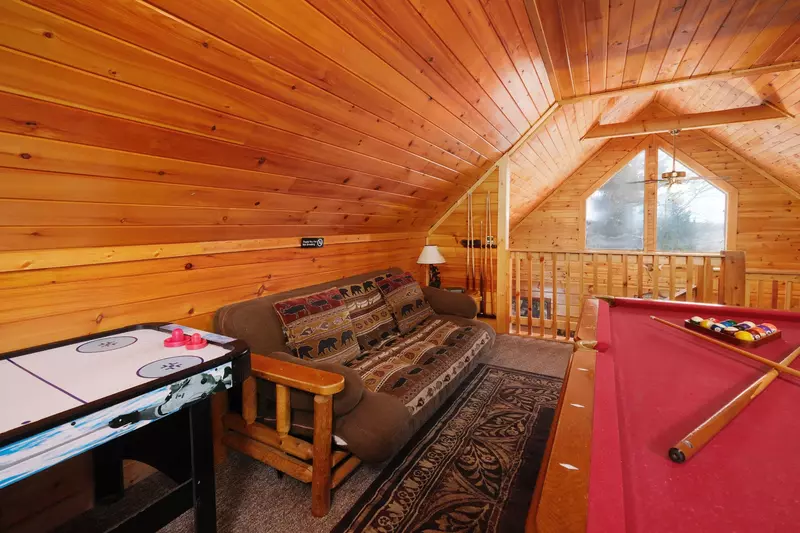 Welcome to luxury living in the Smokies! Bear Country is a gorgeous two-bedroom, two-bath cabin, where up to eight guests enjoy privacy and easy access to all the attractions and restaurants in Pigeon Forge. An entertaining game room, large covered deck, and fire pit give your family and friends plenty of space for fun and relaxation. This is your dream destination!