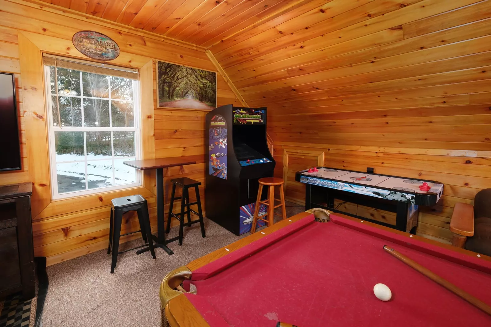 The game room features a large, flat-screen TV, leather sofa, and cafe table, making this an ideal hideaway for kids and teens.