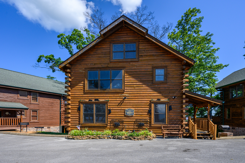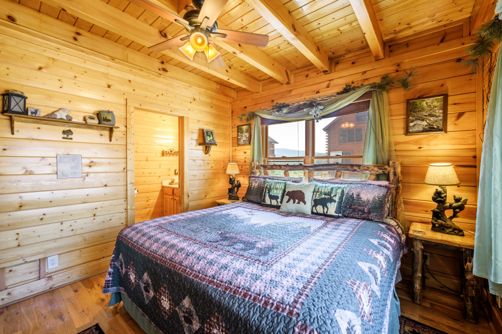 Inside, vaulted wood-beamed ceilings, a two-level wall of windows, and wood crafted furniture add to the adorable bear décor that fills this home. This spacious cabin can sleep up to 9 guests. The main-floor master bedroom features a king-size bed with an attached en-suite bathroom. A queen sleeper sofa also is available on the first level. Upstairs in the large loft is a queen handcrafted log bed, additional queen sleeper sofa, gaming area, and a second full bathroom with a separate jetted tub. A second upstairs loft area is accessible by ladder and features a twin bed for an additional child.