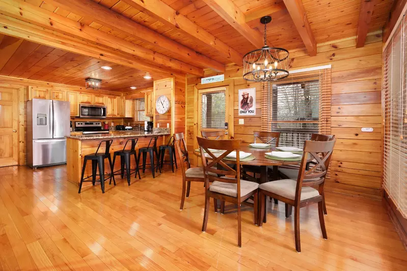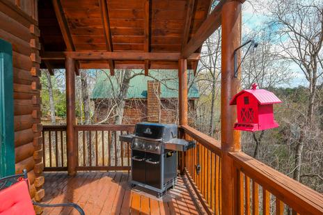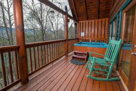 A welcoming front porch wraps around the cabin to become a beautiful deck. Old-fashioned rocking chairs and cushioned chairs are waiting for you to kick back and enjoy the fresh Smoky Mountain air. The gas grill is ready for your favorite steaks, chicken, or veggies. The bubbling hot tub on the deck, with a stunning view of the forest, is your 24/7 private oasis to use day or night.