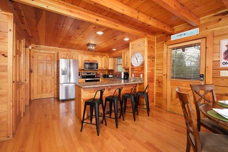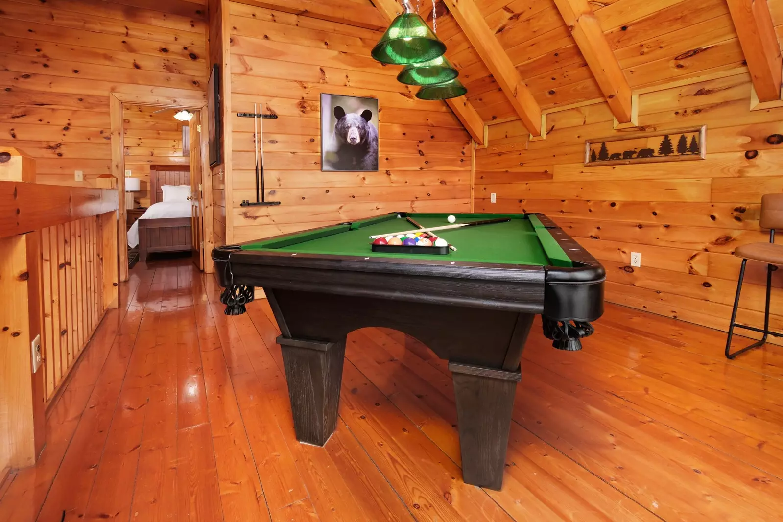 Upstairs in the spacious, well-lit loft is a state-of-the-art pool table, barstool seating and an incredible view through the huge, ceiling-height windows. It’s the latest addition to Beary Relaxing’s ample amenities.
