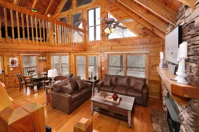 Paneled with rich wood, the open plan living area boasts a cathedral ceiling, exposed beams, and a satin-smooth hardwood floor. A whole wall of windows, reaching up to the peak of the roof, brightens the space with natural light. The buttery-soft sleeper sofa and loveseat invite you to flop down and check out shows or sports on the flat-screen TV. Light a fire in the river stone fireplace. Break out the board games or that book you brought along.