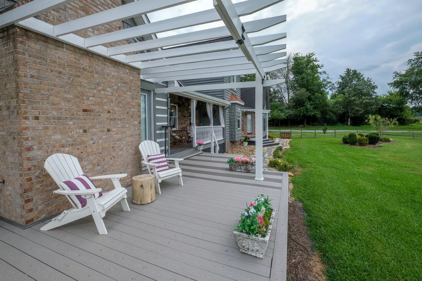 -Back yard has deck with hot tub, small pond, fenced in yard, corn hole