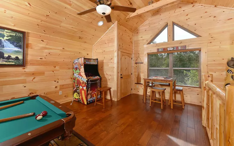 Part rec room, part living room, the loft in Charlie Brown’s Cabin features a family room, 50-inch HD flatscreen TV, DVR and DirecTV, DVD player, and a game area kids and adults will love. Shoot some pool while you’re hanging out in the cabin, sit down with a drink or a board game at the pub table for 4, cozy up in the 2 Big Joe gaming chairs, play on the new arcade system, and watch a comedy show from the leather sofa.