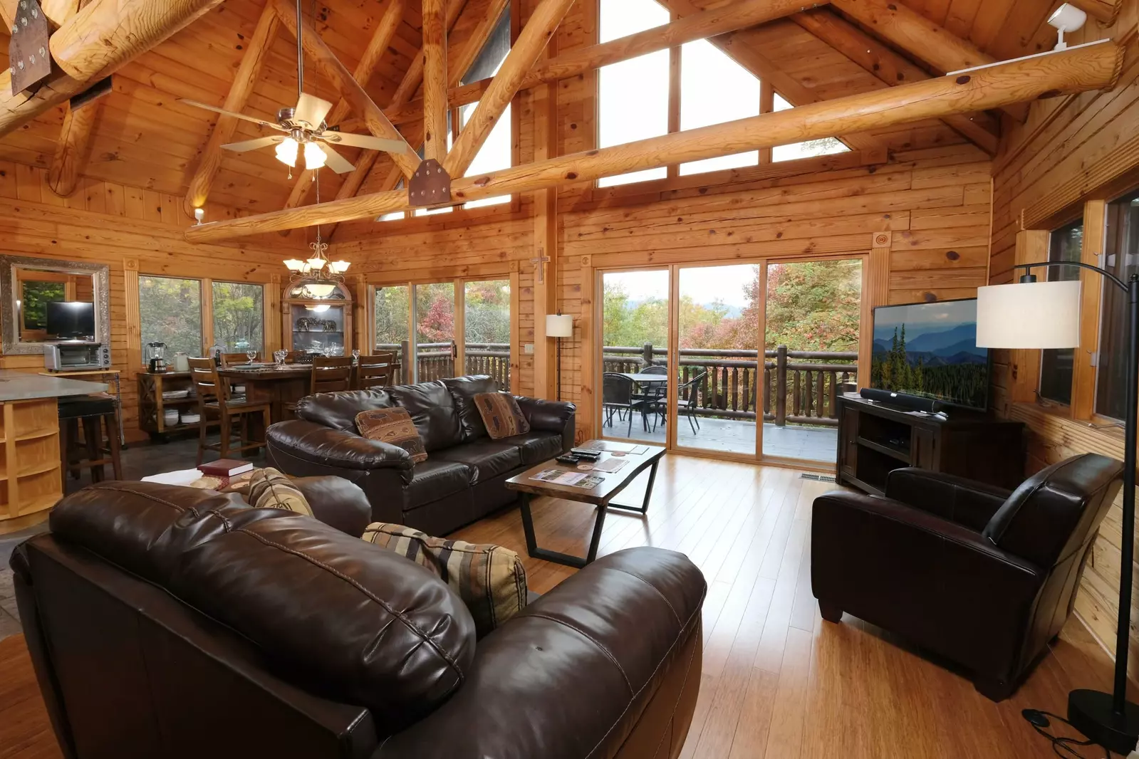 Settle into Christine’s Cabin in the open concept living space that features hardwood floors throughout, elevated ceilings with exposed log beams, a river stone (wood-burning) fireplace, and windows from floor to ceiling streaming stunning scenes of Mt. LeConte into the home. The big screen TV with Blu-ray and DVD players is perfect for movie nights with loved ones with refreshments on the coffee table. Sit back and relax on the sofa and love seat for chats with friends and break open a new book with a glass of bubbly next to a crackling fire on cool eves.