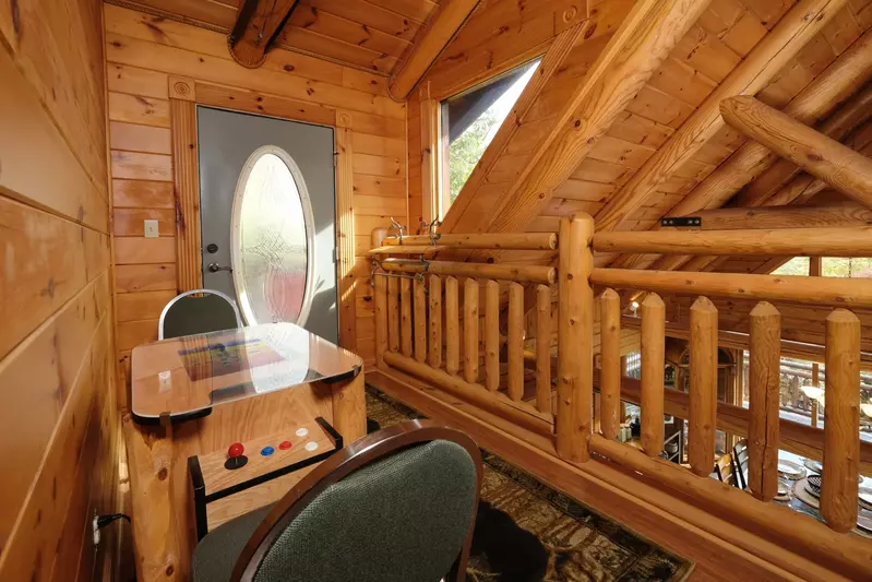 With exposed log beams overhead and bright mountain views to wake up to, the loft bedroom with a king-size bed is a great escape from the hustle and bustle of the day. In addition to the flatscreen TV, there are also bedside lamps for late-night reads and a tabletop arcade unit just down the way for extra fun upstairs!