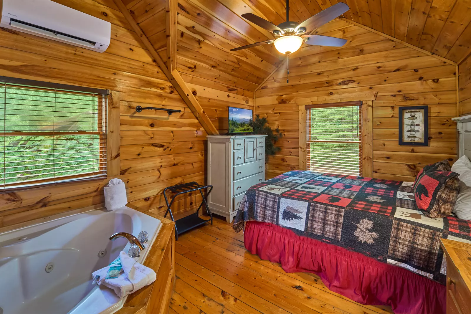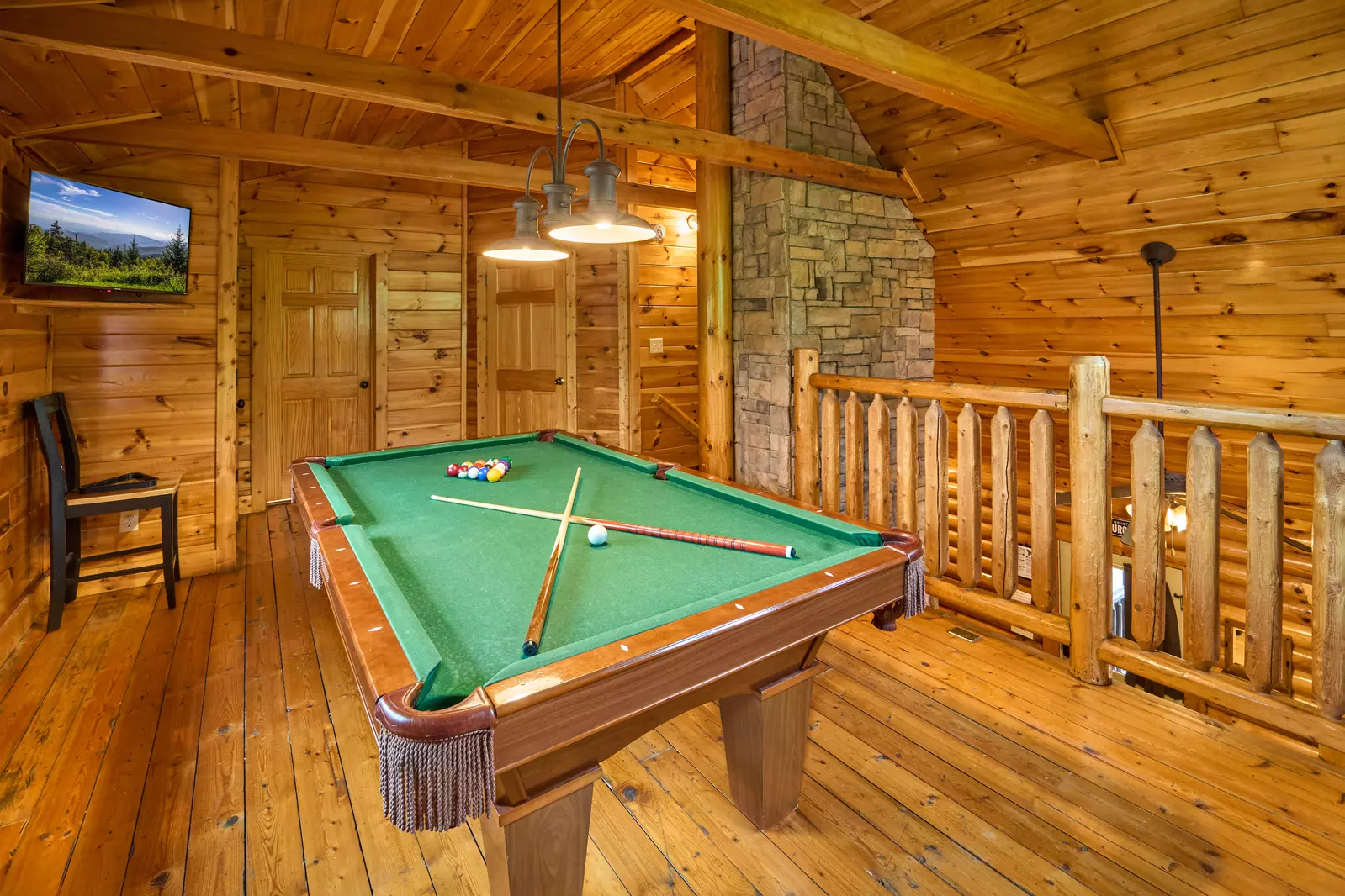 3 stories of rustic luxury in this true log cabin with 2 suites, bonus room and private hot tub on 1 of the 2 decks. Enjoy your stay in the Smoky Mountains with your own private Home Theater room with 9 Foot Screen, high definition theater projector and surround sound. Upper level private queen suite includes bath, jacuzzi tub and beautiful woodwork with vaulted ceilings and ceiling fan. Lower level bonus room features queen over queen bunk beds! Catch cabin fever by enjoying one of the 6 TV's. Gas Grill, Pool Table, Hot Tub, Jacuzzi Tub and Free Wireless Internet!