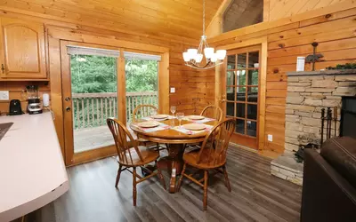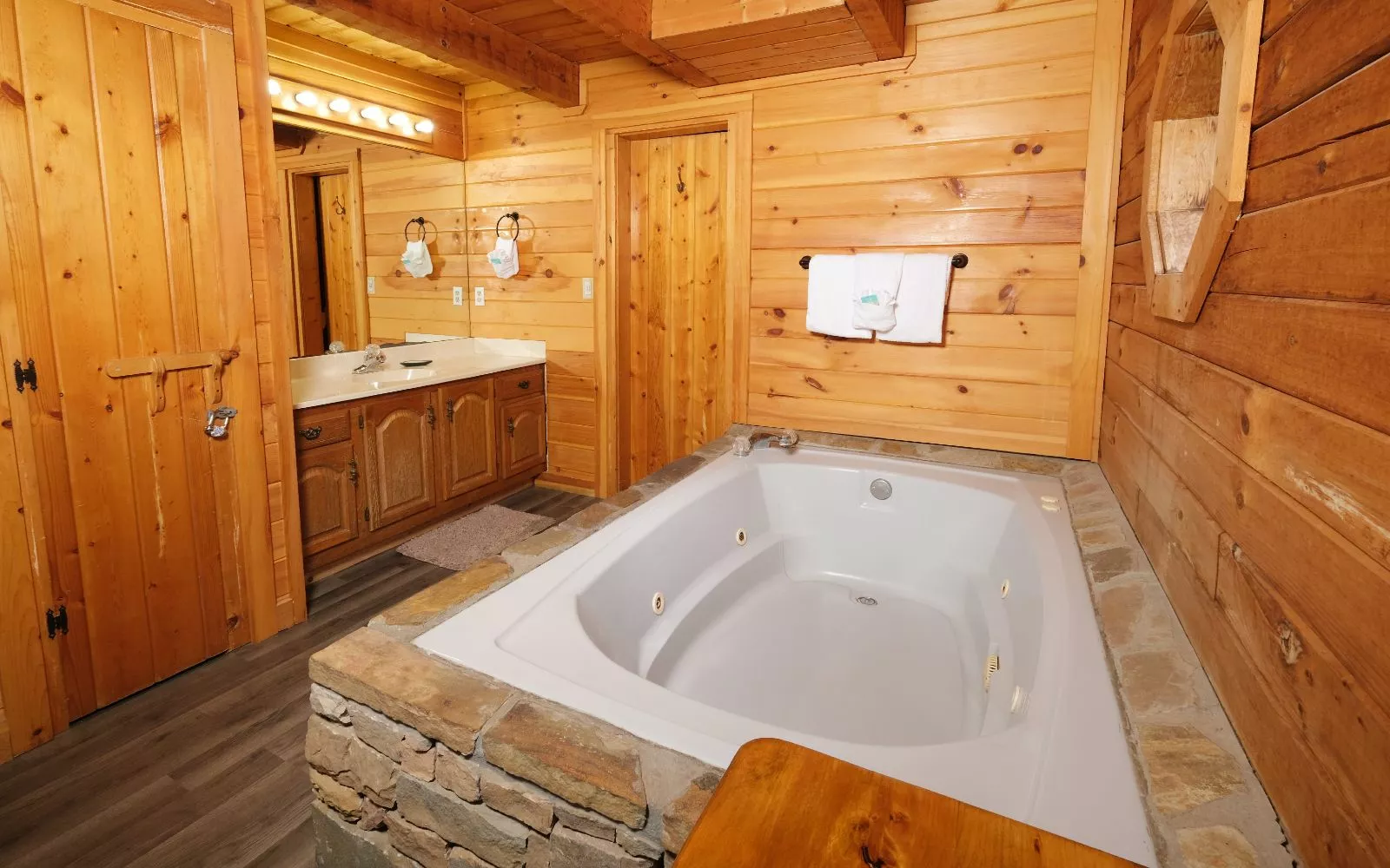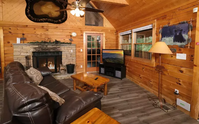 It’s time for bed at Heaven on Earth, where 2 bedrooms offer comfort with a king-size bed and TV in the loft and a king-size bed, direct deck access, plus an indoor jetted tub in the master suite. Encompassed in stonework, the jetted tub is the perfect place to unwind after a full day of play, with bamboo melodies and scented candles. And don’t forget the living room’s queen sleeper sofa for extra guests (as the cabin can sleep 6) plus the 2 full bathrooms that make getting ready a breeze.