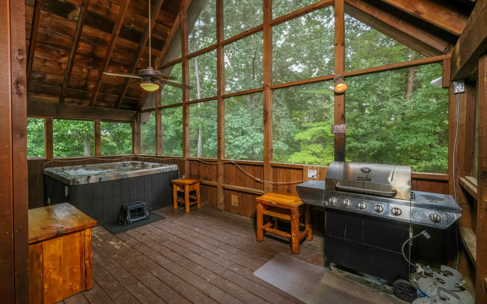 Outdoors at the secluded Heaven on Earth, bond with nature as you listen for songbirds on the porch swing and enjoy lemonade in the rocking chairs on warmer days. On the screened-in deck, cook burgers and veggie kabobs with the gas grill, dine at the picnic table, and soak in the bubbly hot tub — with tranquil tree-studded views! And when you’re ready to head to town, follow the ramp or stairs to the paved driveway.