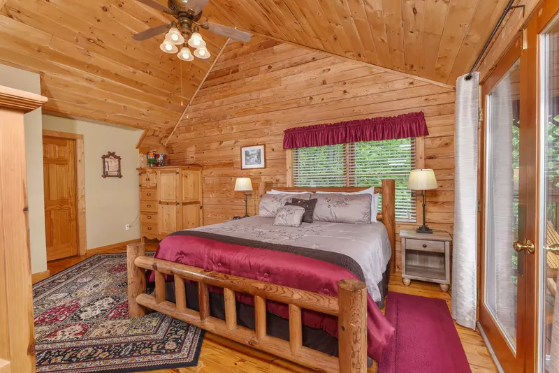 The master bedroom on the main level has a luxurious king size log bed, corner jetted tub, a large HDTV with cable and DVD and a full bathroom with a double vanity.