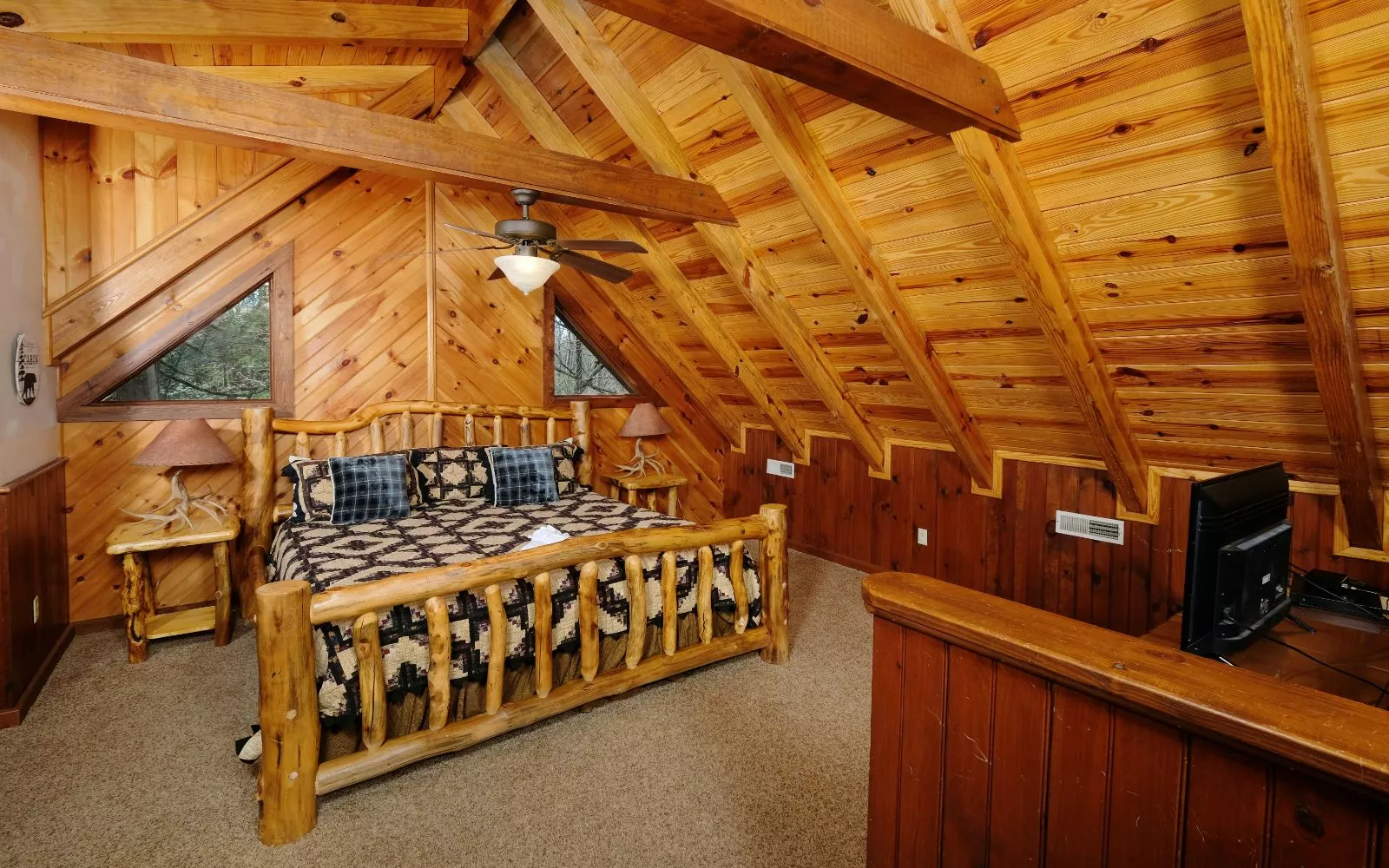 Exciting days in the Smoky Mountains call for cozy bedrooms to retreat to at night. The bedrooms include 2 king-size beds, each with its own TV, one located in the loft. It’ll have you heading to bed early to watch movies or staying in bed late to just relax. Charming mountain touches complete the rooms, and features like log furniture and windows for plenty of natural sunlight will remind you you’re tucked away in a cozy mountain cabin. You’ll even have a jetted indoor tub where you can treat yourself to a relaxing bath before bed. For extra space, the cabin has a queen sleeper sofa.