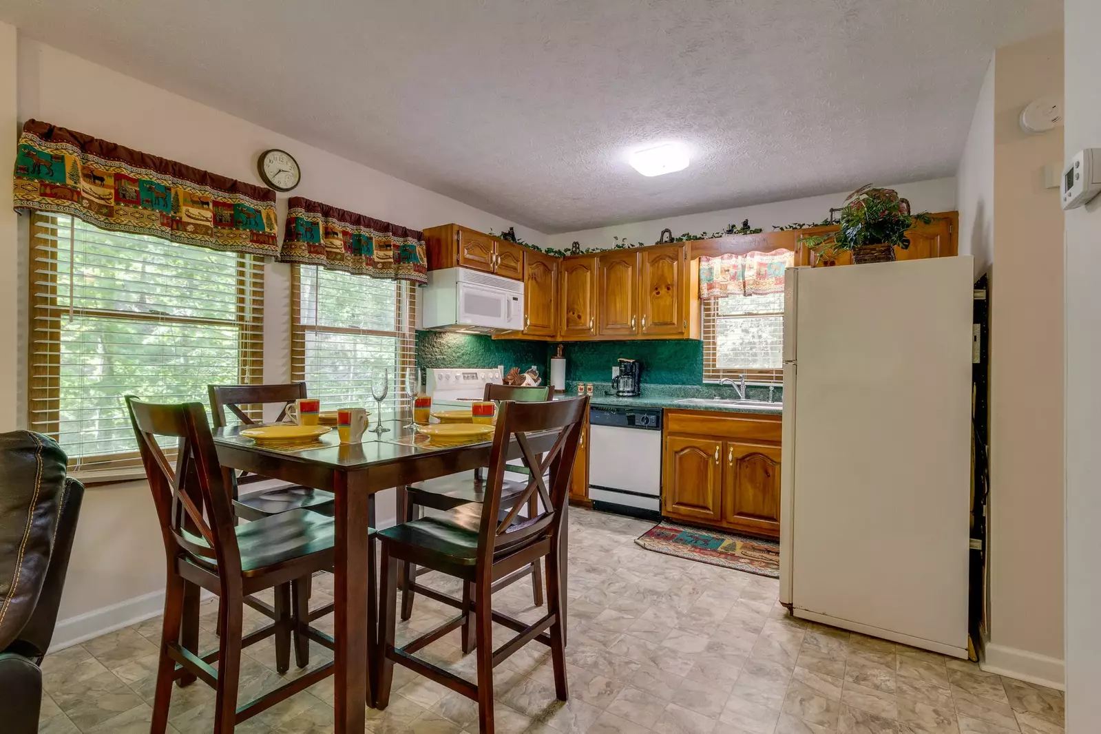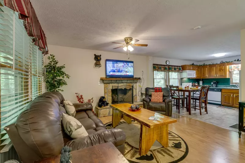 High Enough for Me Cabin Rental, features 2 bedroom, 2 bath (tub shower combo) and will immerse you in privacy in a serene lush cool canopy of hardwoods. The perfect place to relax and experience a Smoky Mountain High but still close enough to take full advantage of everything Pigeon Forge has to offer. HighEnough For Me cabin is located just minutes from Dollywood and the strip of Pigeon Forge High Enough For Me cabin has a spacious open floor plan, living room complete with flat screen TV, gas fireplace and leather furnishings including 4, yes that is right, 4 recliners, perfect for relaxing. The kitchen is fully equipped for those days you don't want to visit one of the many restaurants in the area.. There are 2 full baths (tub shower combo), two bedrooms, one king, one queen both decorated in true Smoky Mountain Decor. But the most incredible part of this remarkable cabin is the covered deck that will let you enjoy the beautiful surroundings while either sitting and relaxing OR while letting all of your troubles soak away in the hot tub. Book High Enough For Me at great "Affordable Cabins in the Smokies" rates,