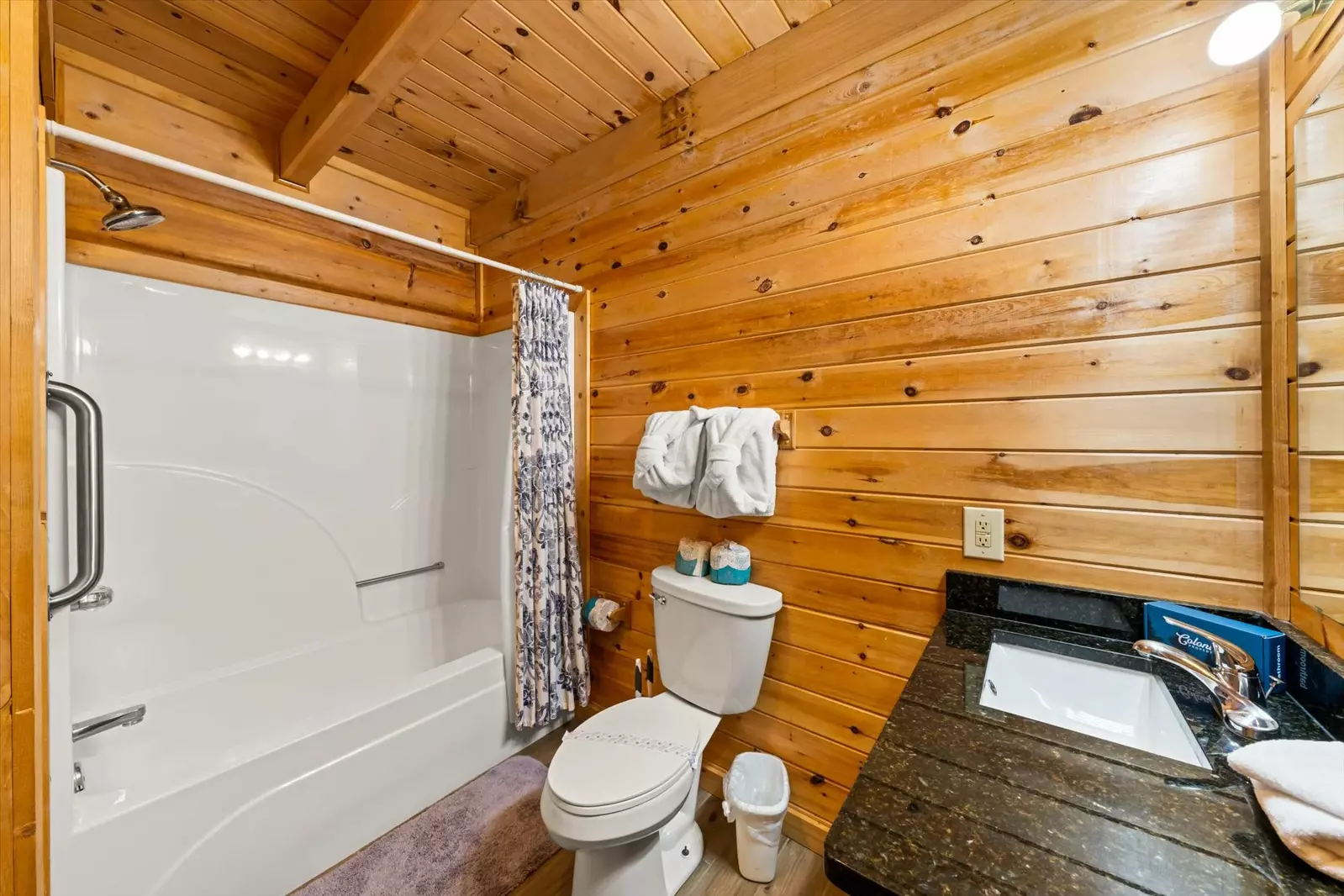 The main level features a cozy living room, a granite countertop kitchen, a dining area, and two bedrooms. The living room features ample seating, a large TV and a wood burning fireplace. Right off the living room you will find the granite countertop kitchen which comes fully equipped with everything you might need. Right off the kitchen you will find the dining area which can accommodate up to six individuals. The two bedrooms on this level both feature king beds. Both of which include full bathrooms and HDTVs. There is also a washer and dryer on this level.