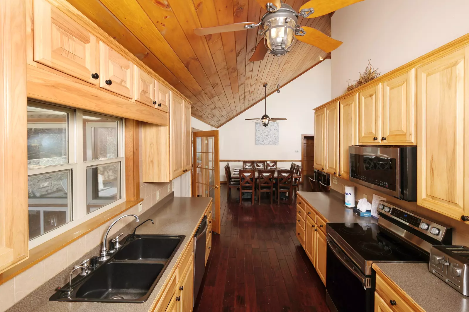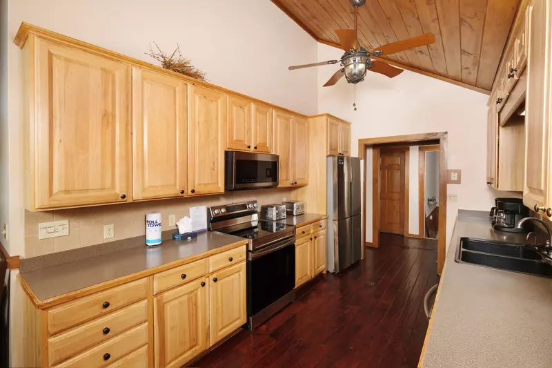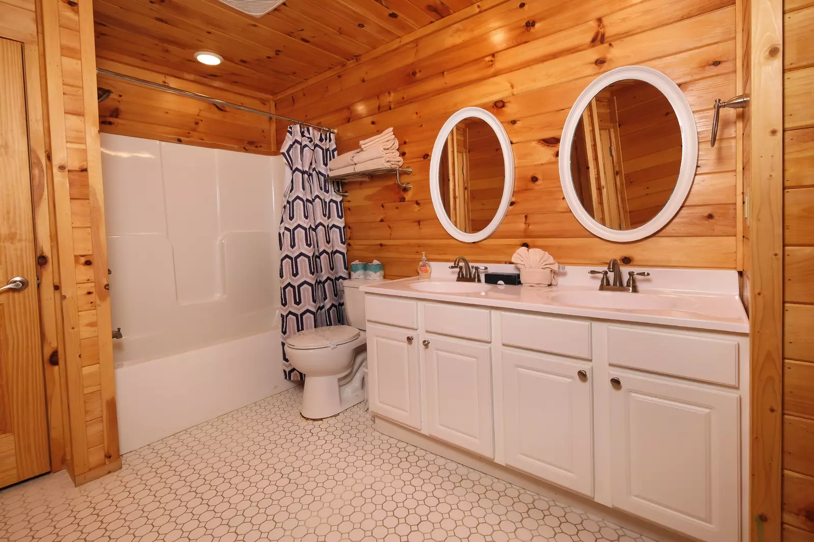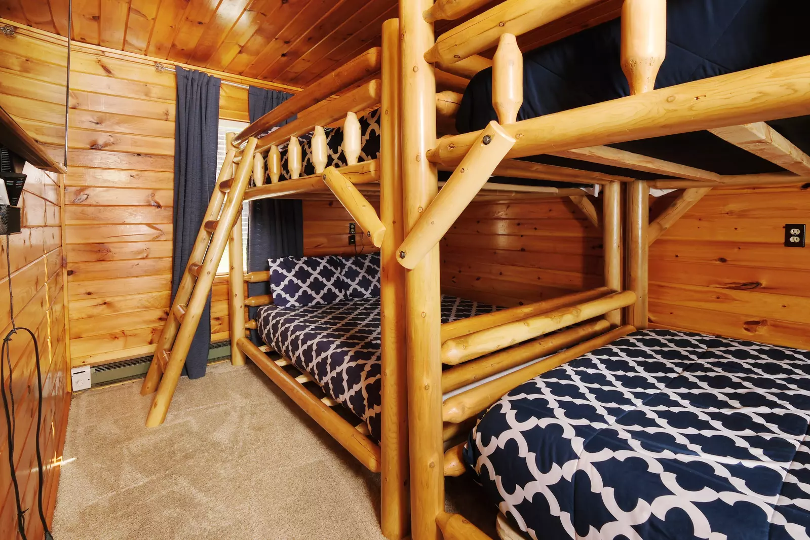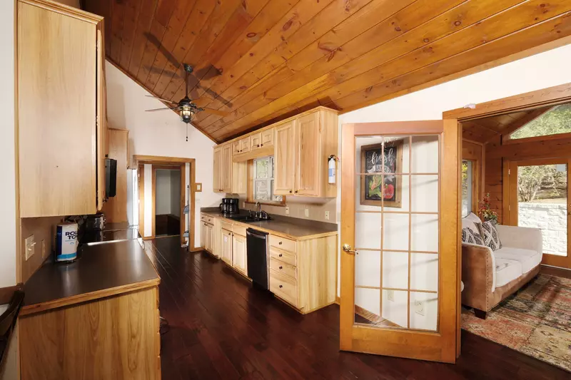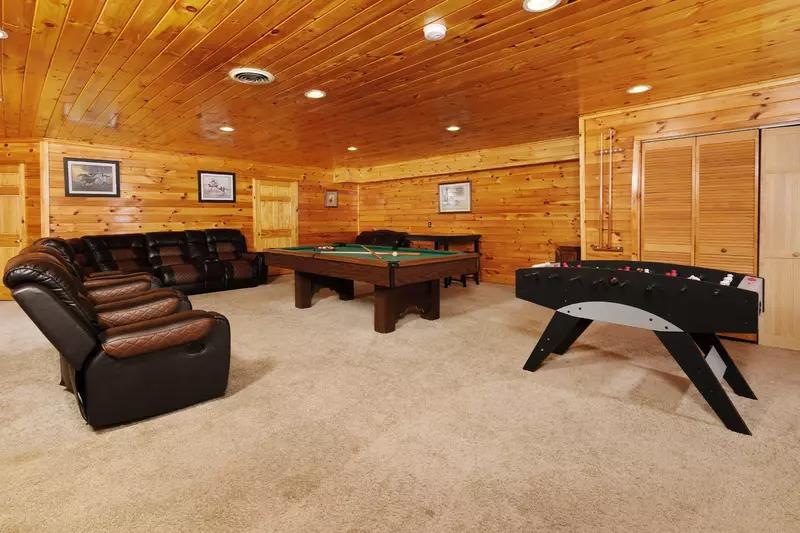 The lower level of this cabin features three bedrooms, three bathrooms, an entertainment area, the laundry closet as well as yard and pool access.