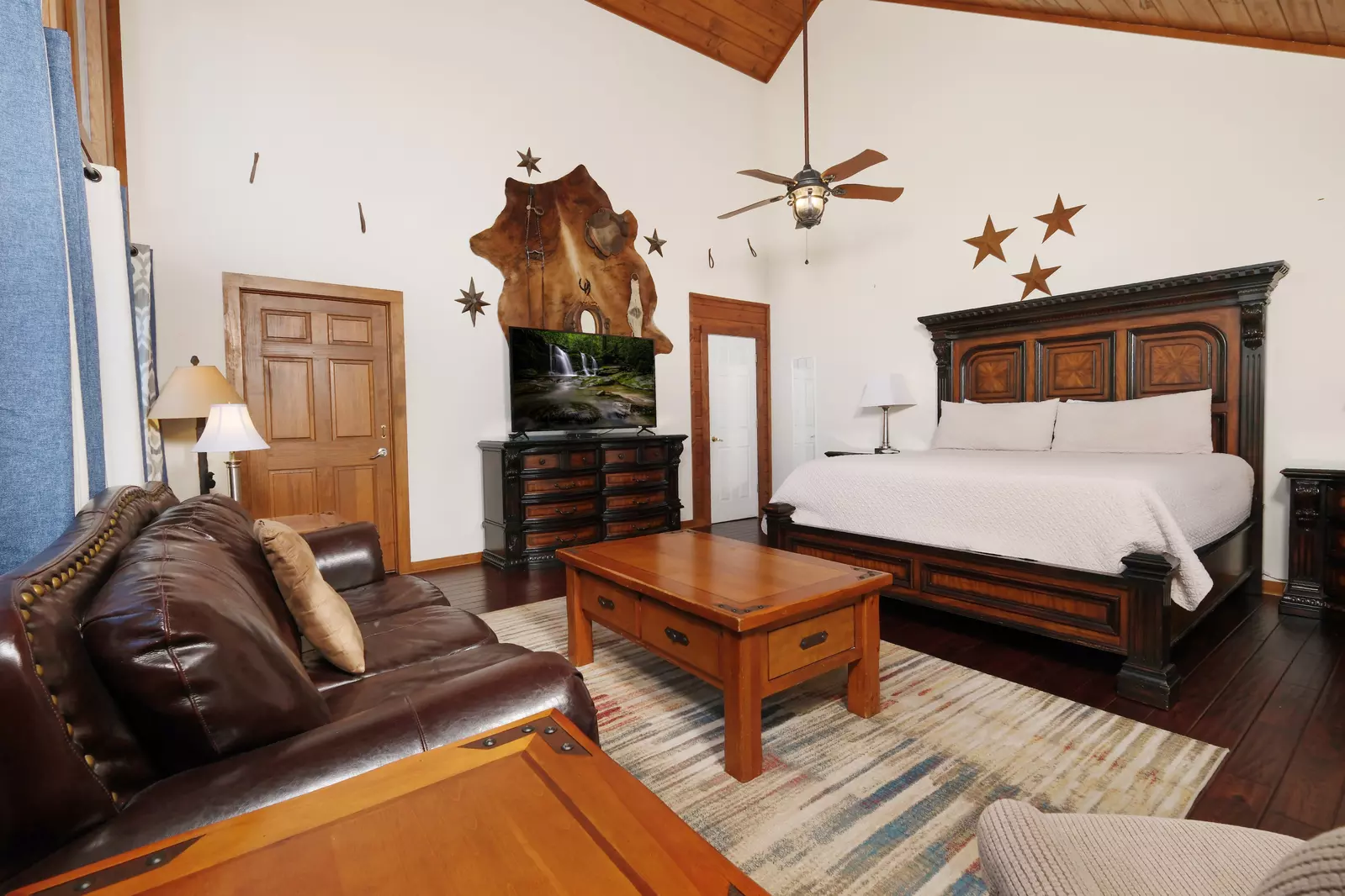 The 1st bedroom on this level features a king bed, HDTV, a couch, and a full bathroom with a step-in tiled shower.