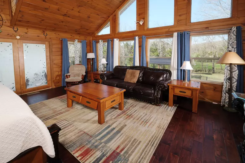 The living room of this cabin features three couches to seat 9 and a large HDTV. The open concept of this cabin offers the dining area which features three tables to seat 20 guests. The kitchen features stainless steel appliances with everything in arm’s reach. Make your way to the day room / sunroom where you will find four couches to seat 10 and patio access. out on the patio you will find a fire pit surrounded by bench swings for the perfect place to gather and make smores as well as the hot tub and access to the private pavilion equipped with charcoal grills and the private pool.