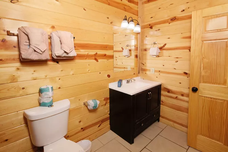 The upper level of this cabin features an entertainment area, two bedrooms, two bathrooms and a back deck. The entertainment area is loft styled and features an HDTV, a pool table, arcade games, a couch, two cushioned rocking chairs, and high top seating for two. There is also deck access.