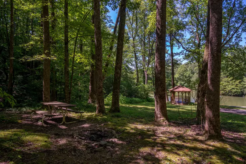 Cabin Resort in the Smoky Mountains “Caney Creek Mountain Area” – Community picnic table, gazebo, and fully stocked catch and release fishing pond