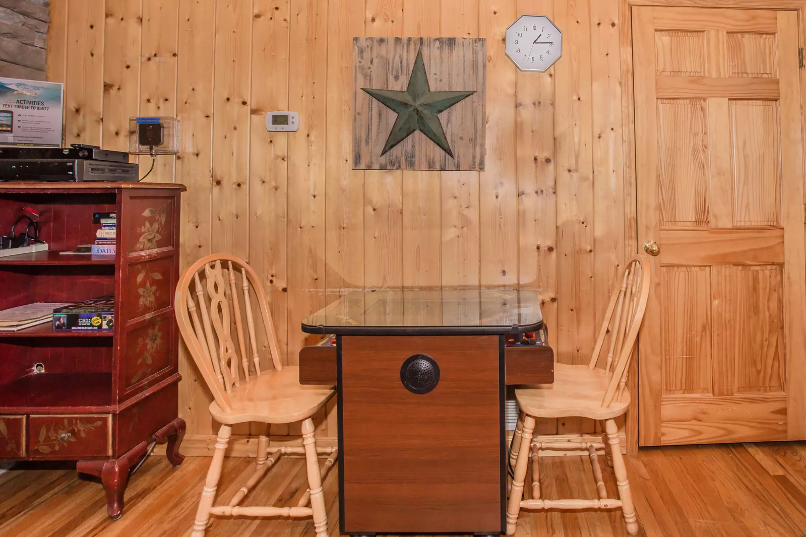 The open plan living room has a sleeper sofa, satellite HDTV with DVD, a cozy, stacked-stone gas fireplace and a table-top arcade game. The fully equipped kitchen provides everything you will need to make a hearty meal. You can also cook that perfect steak on the outdoor charcoal grill. The dining table has seating for four.