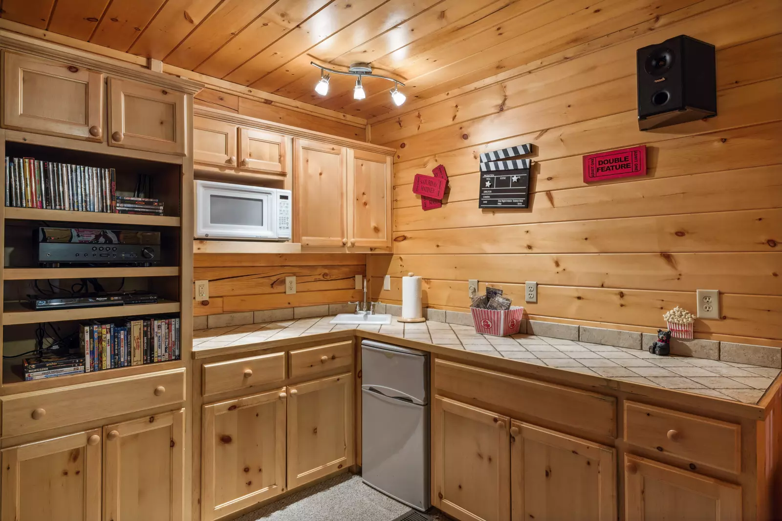 There’s something for everyone at Mountain Mist Retreat! You’ll be blown away by the huge theater room featuring a 10.5’ projector screen, six stadium seating recliners, a sofa sleeper couch, and two five-feet wide poufs - big enough for an adult to feel like a kid again! The room also features a kitchenette with a wet bar, microwave, and mini-fridge. Plus a wide selection of DVDs are available. Or stream movies from Amazon Prime (included) or sign in to your favorite streaming app. There are also a variety of puzzles, board games, and children’s toys in the chest and cabinets.