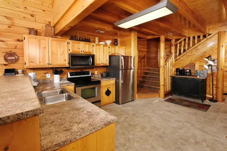 Old Hickory’s two airy bedrooms both feature ultra-comfortable king mattresses, flat screen TVs, and rustic log furnishings. Lie back under the cooling ceiling fans and plan tomorrow’s Pigeon Forge excursions. The two full bathrooms give everyone space to get ready without crowding. The master bathroom has a deep, jetted tub where you can soak your cares away.