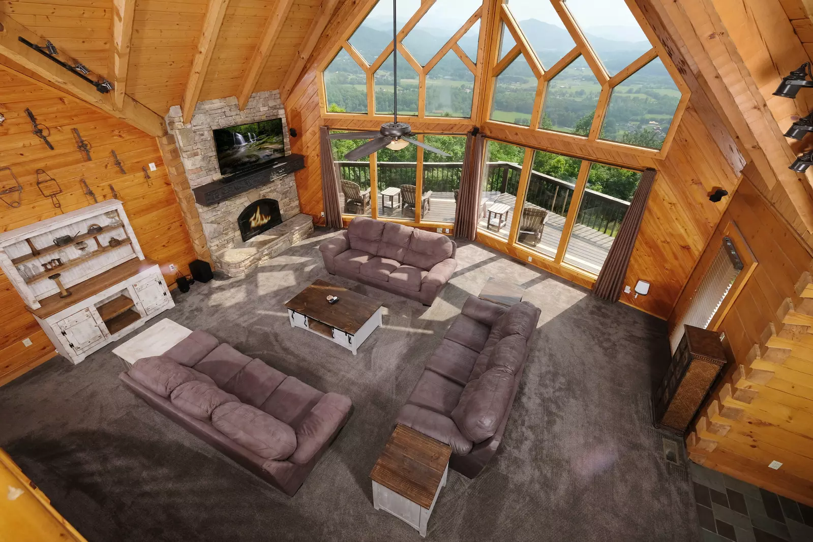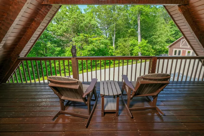 When you pull up the driveway and get to take in the gorgeous grounds of this Wears Valley cabin, you’ll immediately understand why it’s named Top of the World. On top of a mountain with views of the valley and the national park, it’s truly an unrivaled view of the Smokies. At the top of the driveway is the adorable barn that boasts an indoor pool- it has privacy, comfort, and luxury! There is also a full bathroom in the pool area. To the left of the home is an outdoor fire pit, where you can comfortably sit to roast marshmallows while taking in that world class view.