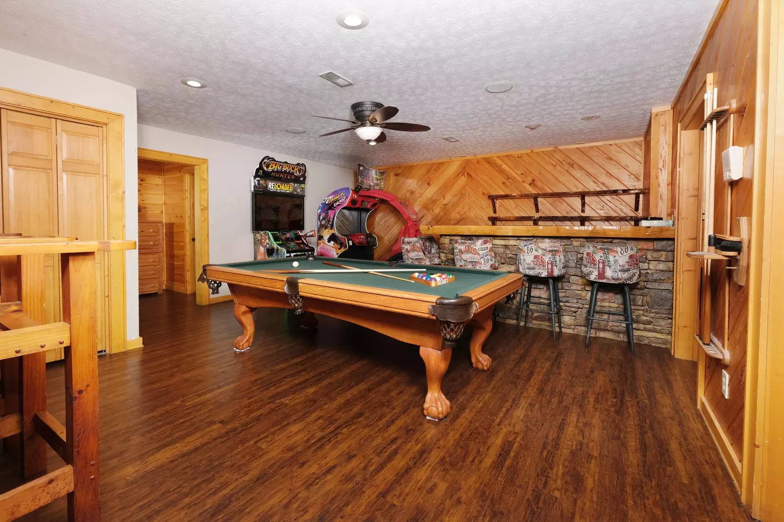 The fun doesn’t even end upstairs- head downstairs to the lowest level and take advantage of the nonstop entertainment! Pool table, wet bar, arcade games (Buck Hunter and racing games, anyone?), air hockey, movie theatre…. Need we say more?? When you walk out onto the lower level deck space, you’ll find even more options to catch the breathtaking views, but our personal favorite is from the bubbling hot tub! Also on the lowest level are 2 more king-sized bedrooms both with TVs, three sets of twin bunkbeds, two full bathrooms, and a laundry room.