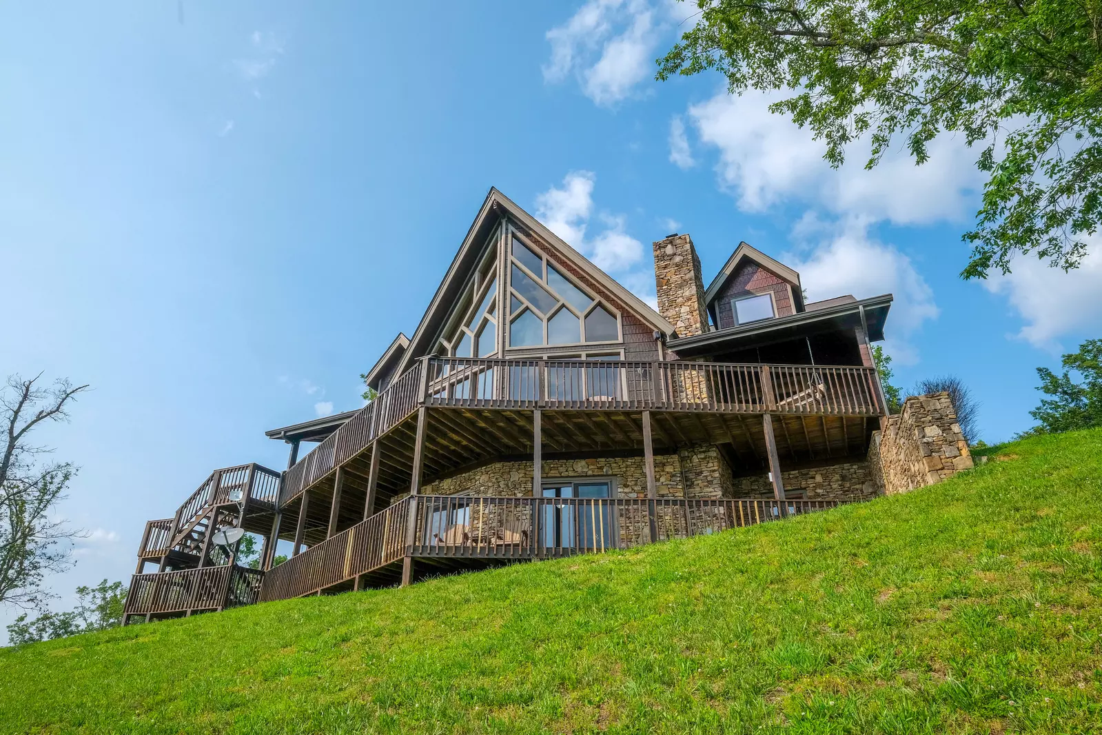 You will enter Top of the World into the main level’s foyer, where a set of queen bunkbeds are located, and to your right is the fully-stocked kitchen and dining area. With an industrial sized refrigerator and tons of space for seating and eating, you have all the opportunity to make your favorite meals. Through the kitchen is the massive living room, with comfy couches (1 sleeper sofa), a stone wood-burning fireplace, a flat screen TV, and huge windows that let you take in that AMAZING view even from the comfort of the inside! Also on this level is a king-sized bedroom, a queen-sized bedroom, a full bathroom, and a half bathroom. The deck for the main level has no shortage of seating options, so brew that coffee, pour a cup, and rock away while catching the Smoky Mountain sunrise!