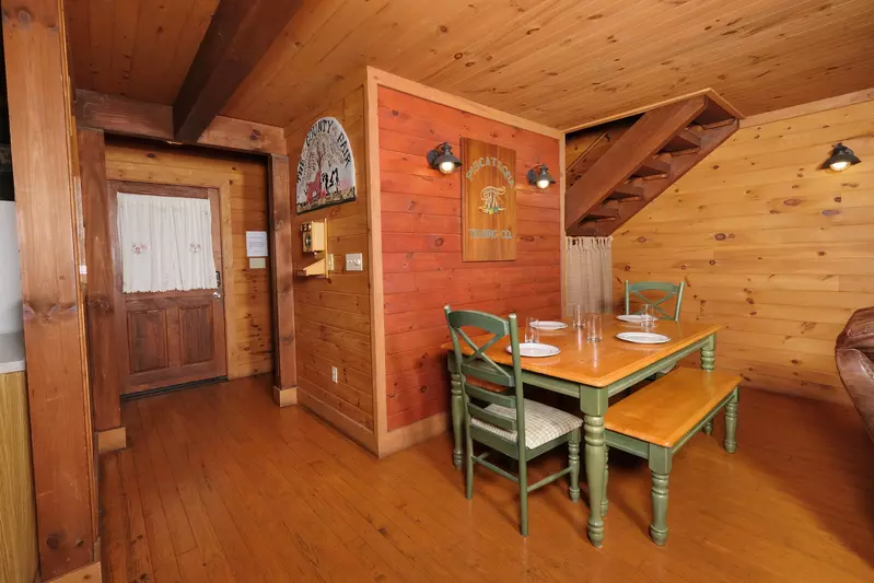 The charming wooden table can seat up to four and is centrally located. Lay out a romantic table and have a candlelit meal! Flickering candles + cabin ambiance= ROMANCE!