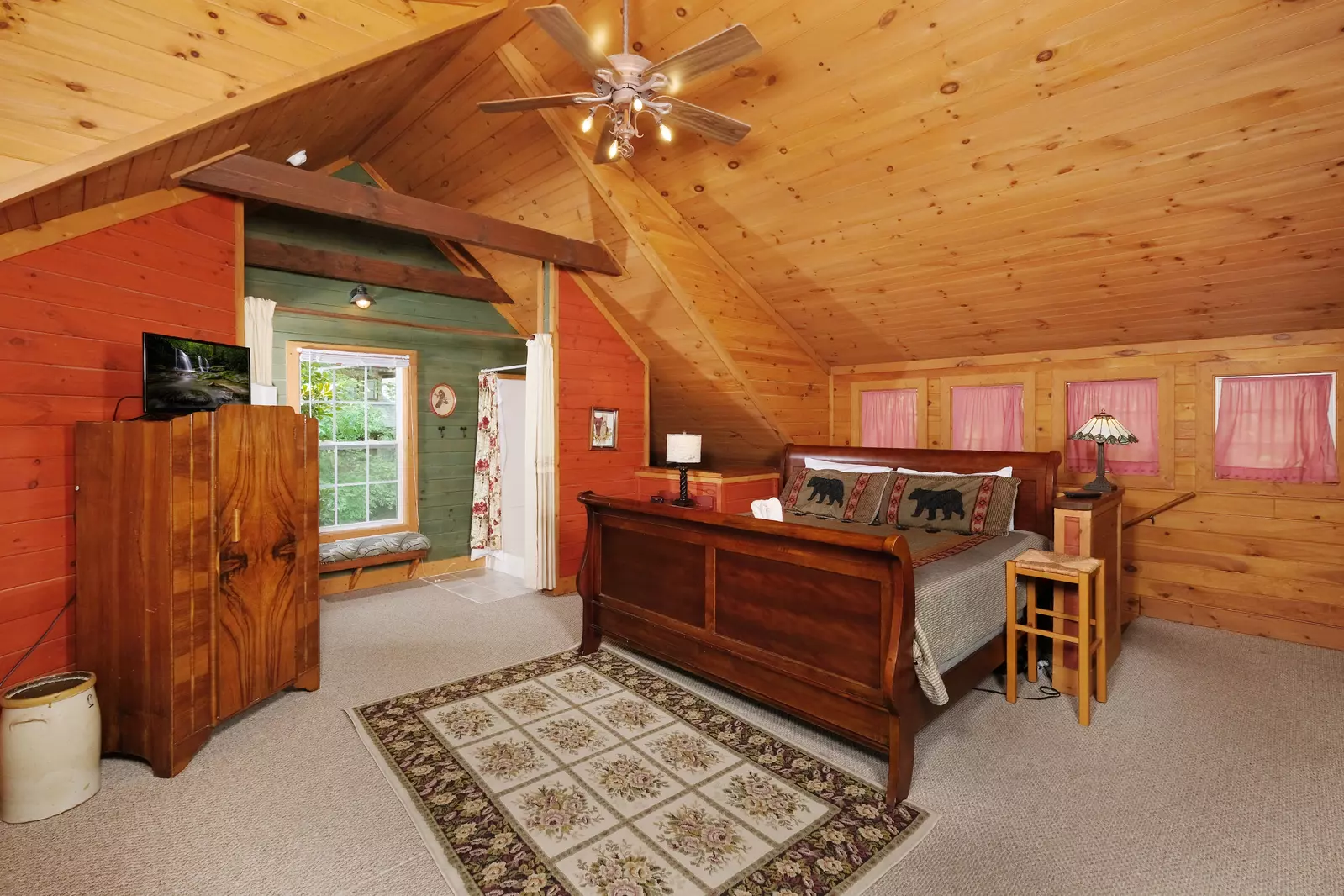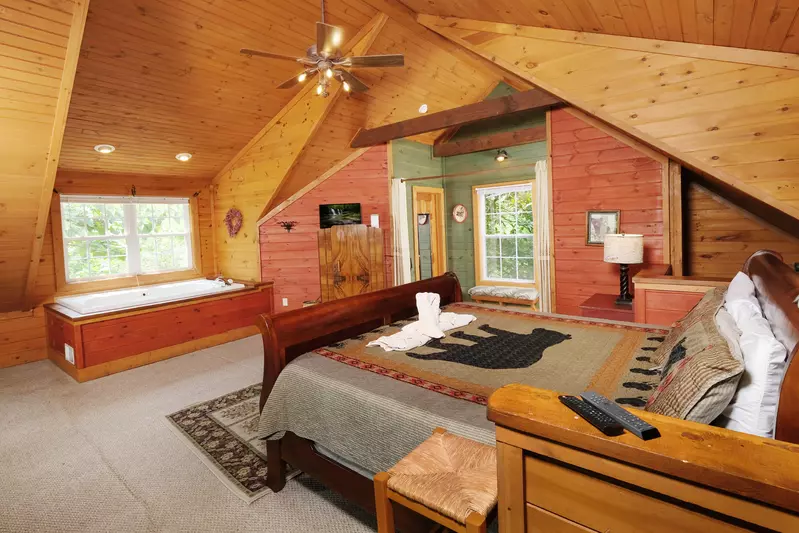 At the end of a long day of sightseeing or hiking, come back to this plush king-size bed in the loft suite. To soothe your aching muscles, soak in the jetted-tub, daydreaming as you enjoy the panoramic views of Mt. LeConte.