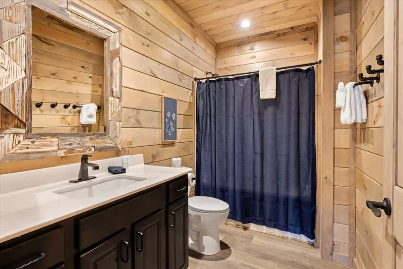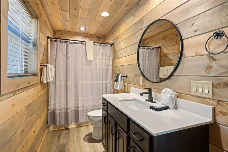 The lower level is where the fun is to be had complete with a tin roof live edge rustic bar and bar seating, game room with pool table and multi-game arcade, and electric stone fireplace. Enter the spacious theater room where you can lounge on one of the two comfortable sofas (one is also a sleeper sofa) while you enjoy your favorite movies or shows on the 75’ Smart TV with soundbar. The lower-level features two additional bedrooms. One bedroom offers a king bed with en suite bathroom and private entrance to the lower deck. The final bedroom accommodates eight persons with two full over full bunk beds with memory foam mattresses and Smart TV. This bedroom also has access to an additional full bathroom in the game room. The utility area is complete with a stackable washer and dryer.