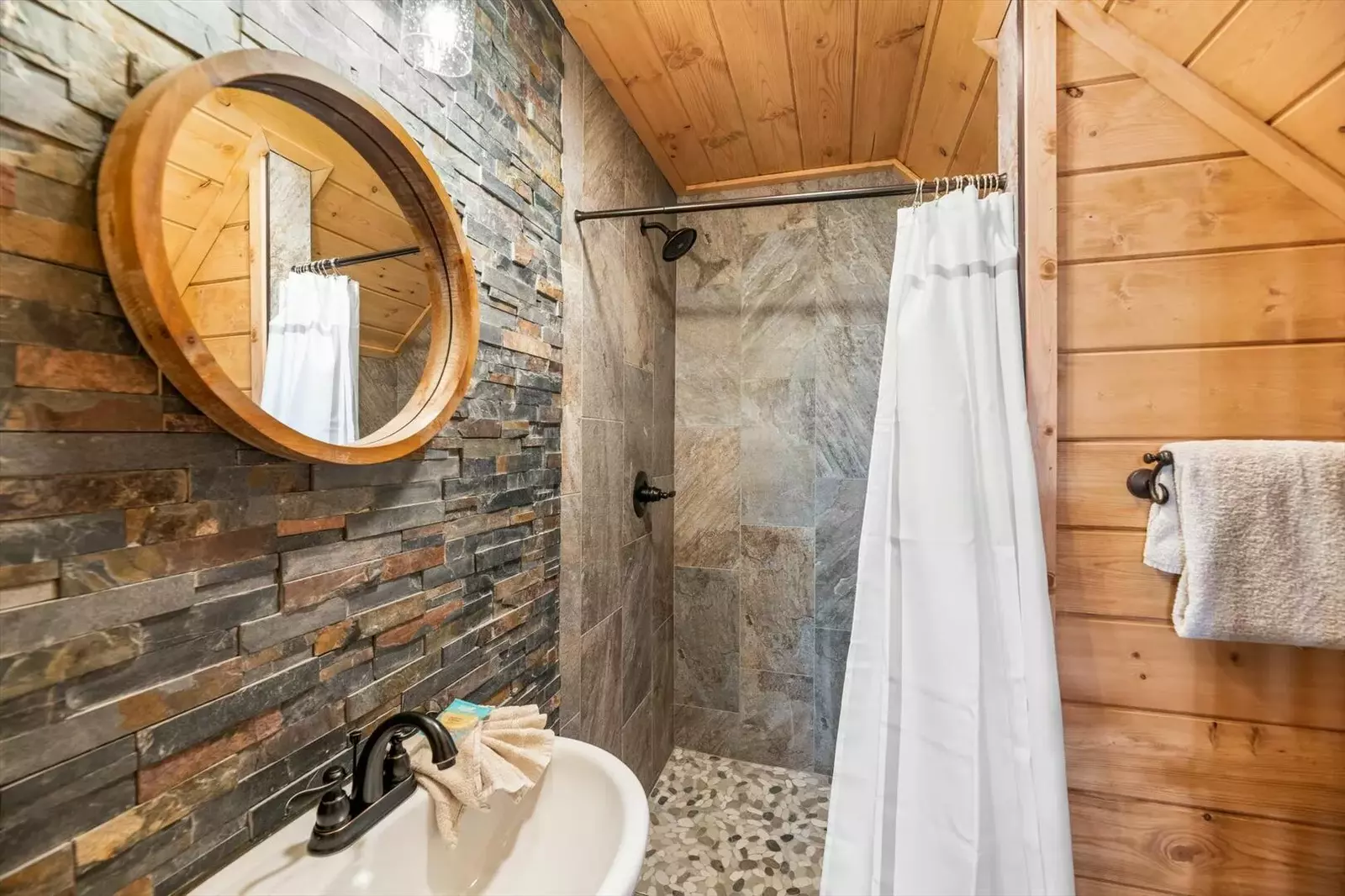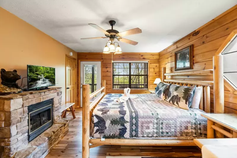 The main level hosts the spectacular master suite. This gorgeous bedroom offers you a comfy king bed, fireplace, flat-screen TV, and deck access. There’s also an adjoining private full bath with a beautiful soaking tub. Take your morning coffee outside in nature! What a way to start the day! Upstairs, you’ll find two additional bedrooms and two full baths with walk-in showers. Both bedrooms feature custom log king beds and flat-screen TVs.