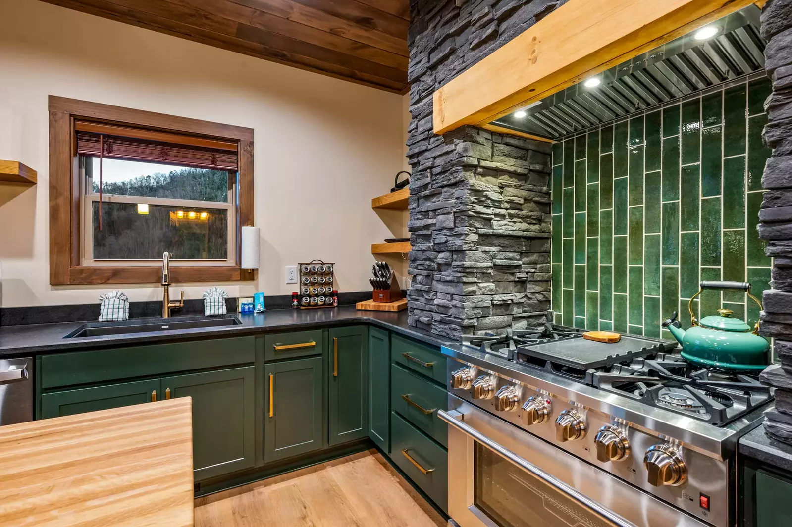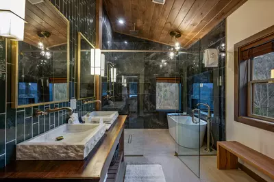 When you arrive, you’re immediately greeted by breathtaking views that stretch as far as the eye can see. Upon stepping inside, you find yourself in a chef's kitchen, complete with top-of-the-line appliances, where you can share laughter and create culinary delights together. The cabin’s exotic hardwood furniture adds warmth and elegance, thoughtfully designed to create an inviting atmosphere. In the living room is a flickering gas fireplace, surrounded by stone, ready to provide the warmth and ambiance that you and that special someone have been looking forward to.