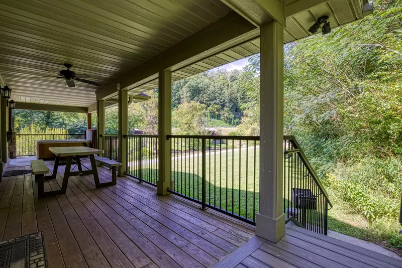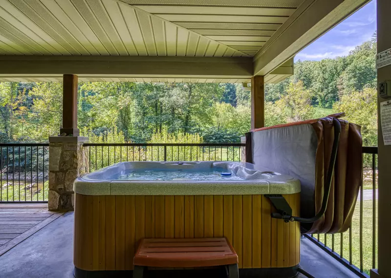 From the huge porch that wraps around the front and side of River Memories, as well as from the upstairs deck, you can kick back on a log rocking chair—a must for any mountain cabin!—and look out onto the river, the woodlands, and the Great Smoky Mountains. The only thing that could enhance the restfulness of the scene would be to experience it while soaking in the hot tub on the porch!