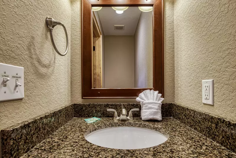 The house’s three bedrooms practically guarantee a fabulous night’s sleep. Each has its own flat-panel TV with DVD player, plenty of storage, multiple windows, and a ceiling fan to help lull you to sleep. The master suite on the main floor boasts a king-size bed and a private bathroom as well. One of the upstairs bedrooms also has a king-size bed; the third bedroom, with two queen-size beds, is perfect for the kids or a family within your group with little ones. The upstairs bedrooms share the second full bath; each floor has a half-bath as well.