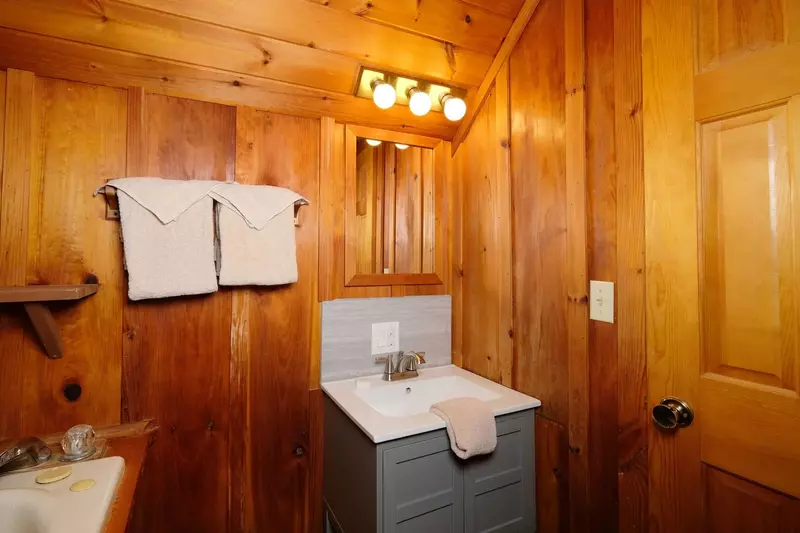 The serene bedroom has exposed beams, natural light, and a comfy bed queen! What a calming place to relax after a long day of hiking or fishing! Watch your favorite shows on the flat-screen TV, or open your window and listen to the crickets! There is a full bath for your convenience!
