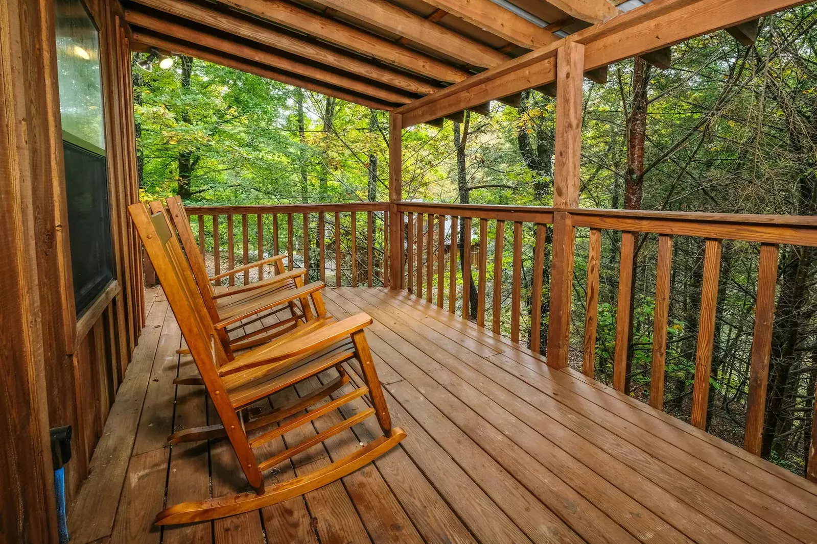 This cabin is such a sweet little gem! You’ll love listening to the sounds of the cascading river as you sit in the rocking chairs on the balcony or soak your cares away with a dip in the hot tub!
