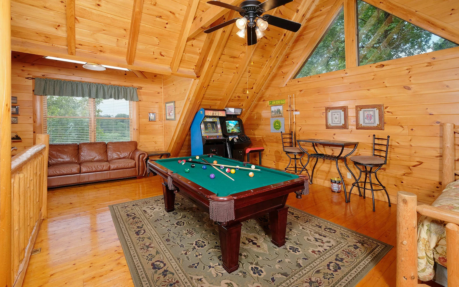 Take your cabin fun to new Smoky Heights in the rec loft — where you can shoot pool with your best pals and beat the highest arcade scores on the Tetris and Maximum Speed (racing) units! There’s also a pub table for 2, perfect for a card game from home with a couple of cold ones to drink. Not interested in games but don’t want to be left out? Chill on the sofa (doubles as a queen sleeper) and cheer on the players. You’ll also find a king-size bed here — awesome for the gamers in your group to play as long as they want, then head to bed when they please!