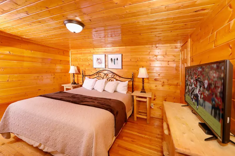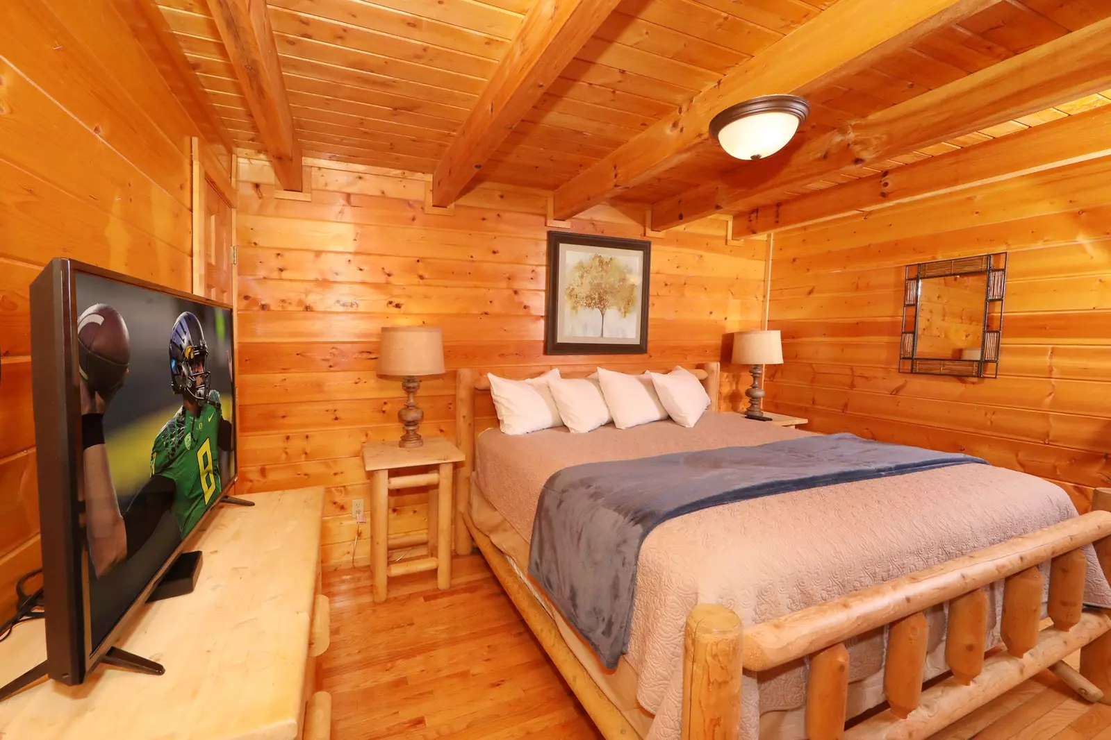 Premium Log Home Two bedrooms on the main level.. Private setting on the end of the Ridge Top with Beautiful Views. Three Bedrooms with King Beds with Full Bathrooms. Master bedroom upstairs has jacuzzi tub and a walk in shower. Also another Half Bathroom in the Upstairs Open Loft with Bunk bed. Washer/Dryer, Central Heat/Air, Multi-Cade Video Game, Pool Table, Hot Tub and TV'S in All of the Bedrooms… High speed internet and Comcast Cable TV. Large Covered Back Porch with rocking chairs and Swing.