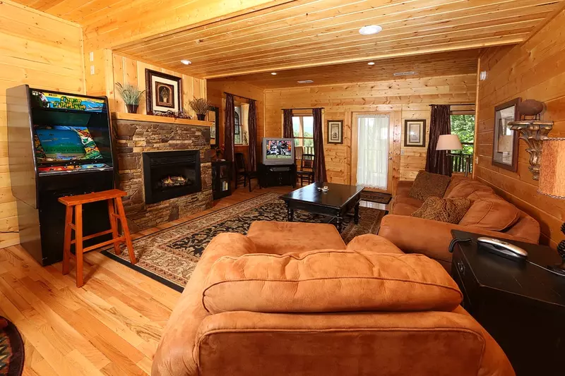 PREMIER PRIVATE CABIN WITH MOUNTAIN VIEWS SURROUNDED WITH TREES… THIS LUXURY CABIN IS ON A LEVEL LOT WITH PLENTY OF SPACE…. 1/4 MILE TO THE HEATED POOL, PUTT-PUTT COURSE, FOUR FISHING PONDS,HIKING TRAILS AND PAR THREE GOLF COURSE PRIVATE Three Level Luxury cabin/Lodge with Beautiful Mountain Views . Oak and Pine trees all around the cabin/lodge….ABSOLUTELY THE FINEST IN THE SMOKIES… 5 Bedrooms, 1 loft bedroom, 5 full Bathrooms, one half bath. Sleeps 8 Adults & 6 Children. 4 King Beds, Twin bunk in loft, Queen/Twin bunk in downstairs bedroom. TVs in every bedroom. Three level cabin with master bedroom on upper level featuring King bed, TV and jacuzzi tub in bathroom. Also on this level is your open loft with pool table. Main level has Kitchen, Livingroom, Diningroom, 2 King bedrooms w/ 2 adjoining baths. Main level deck has your private hot tub and rocking chairs to enjoy the view. Lower level is Family room with card table, wet bar, TV, and Multi-cade Video Arcade System. Also, on lower level is your 4th King bedroom with adjoining bath and another sleeping area with bunk beds (Full bottom/Twin top) and full bath… This cabin is basically incredible. High Speed Internet. Wonderful cabin for a family reunion.