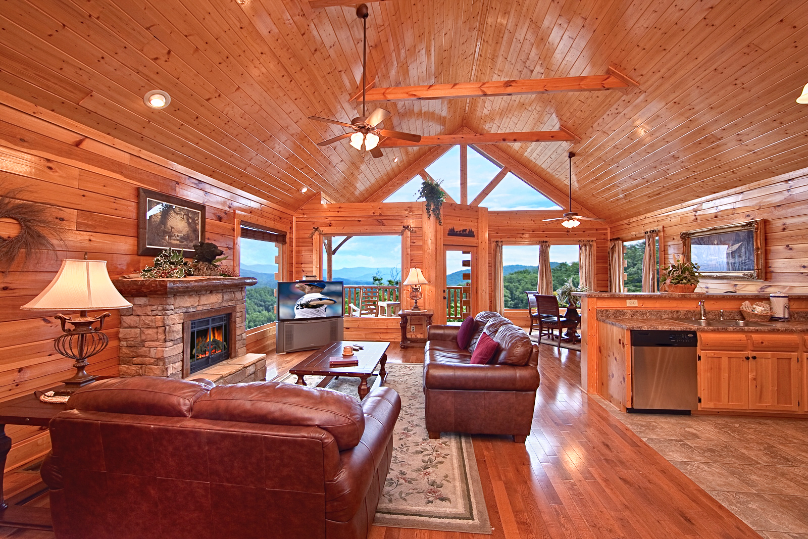Enter on the upper level where you will be greeted by amazing views through the great room with vaulted ceilings. You will enjoy relaxing on the luxury leather furniture in front of the fireplace and big TV with digital cable. The adjoining fully equipped open kitchen is perfect for preparing in cabin meals and is stocked with most the items you'll need including cookware, coffee maker, blender, mixer, toaster, pots and pans. There is a dining room with seating for 4 - a perfect spot to enjoy a meal while surrounded by mountain views.