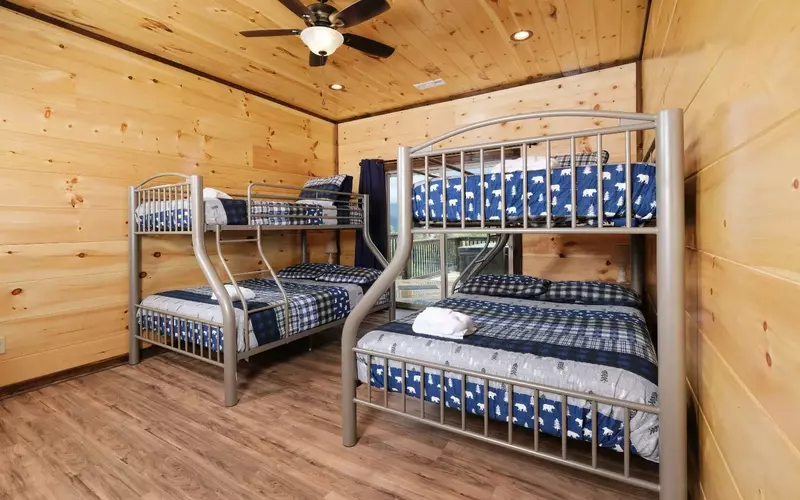 The master bedroom on the entry level features a balcony with relaxing rocking chairs and a propane fire pit for romantic evenings beneath the stars. Bedrooms have their own TVs and include king beds in three bedrooms and two sets of twin-over-full bunk beds in one bedroom – plus a queen sleeper sofa in the loft. Other amenities include a gas grill on the balcony just outside the dining area and kitchen, high-speed wireless internet, and a washer/dryer.
