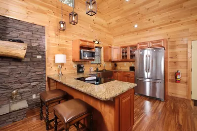 The fully equipped kitchen of Swept Away is a beautiful blend of form and function. All the essentials are here – pots and pans, dishes and glassware, utensils, full-size appliances – paired perfectly with high-end finishes. Burnished cherry cabinets with soft-close drawers are topped with high-end granite countertops and a rustic copper Sinkology farmhouse apron-front sink. Upgraded stainless steel appliances include a double-door refrigerator, microwave, dishwasher, and stove, ensuring you have what you need to make homemade meals in the cabin. The breakfast bar also features 2 leather bar stools where you can have a cup of coffee in the morning or chat while you get meals ready.
